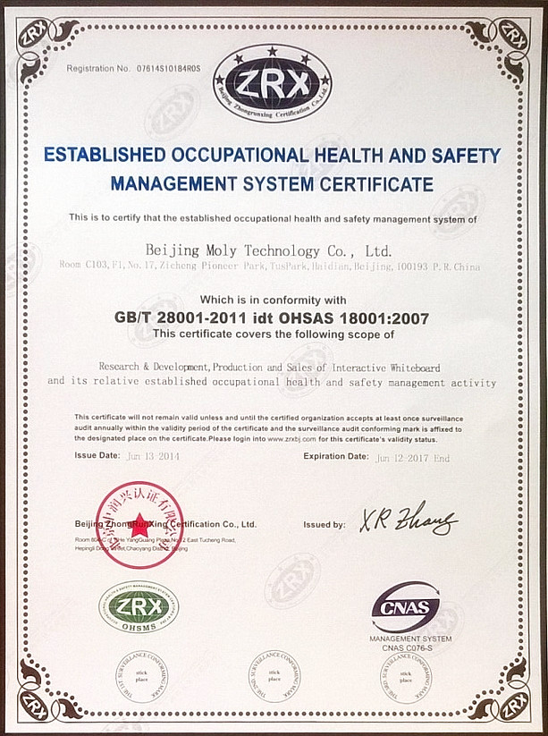 Beijing Moly Technology Co., Ltd. successfully pass the certificate of OHSAS18001,which named Occupational Health and Safety Assessment Series-18001.